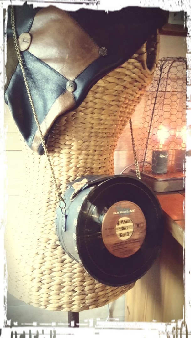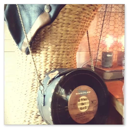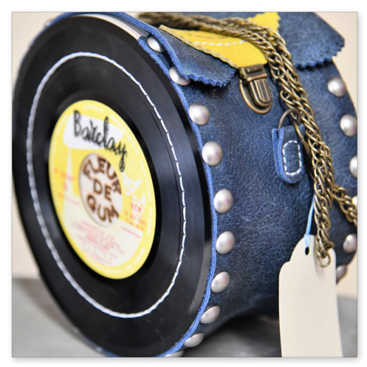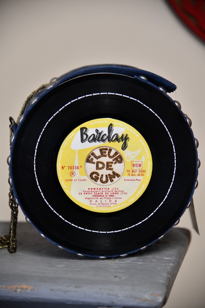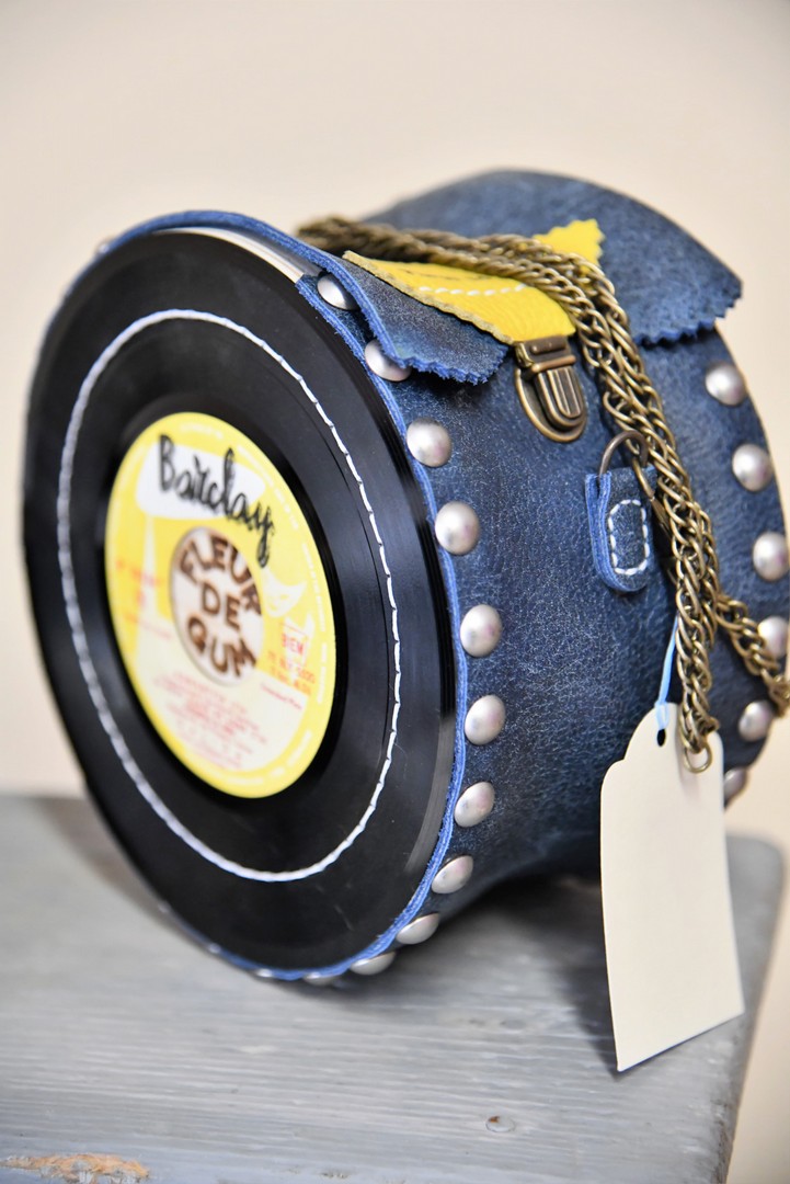 Pour un look total musical, j'ai créé deux modèles de sacs qui mêlent les matières que je préfère travailler : la chambre à air, le cuir et... les vyniles !